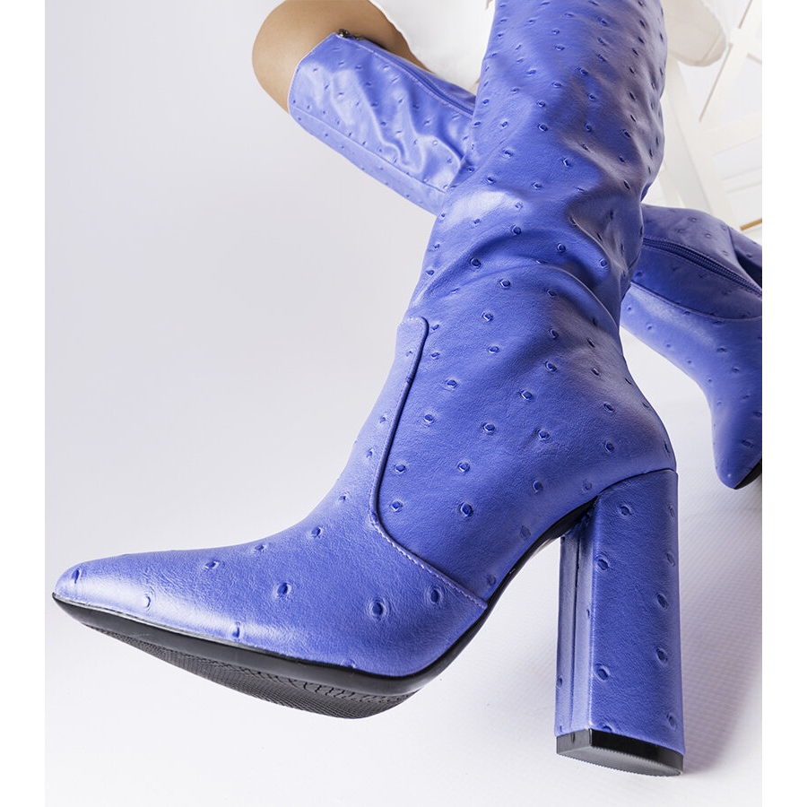 Klackhöjden på 10 cm och blocksnittet gör dessa stövlar till ett utmärkt alternativ både för vardagsbruk och för eleganta tillfällen. Blå Delfina-präglade högklackade stövlar passar perfekt med en mängd olika stilar, från vardaglig till kväll, och ger en touch av lyx och originalitet.