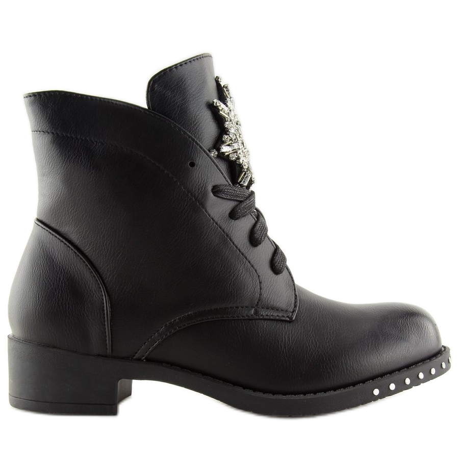 Berika din garderob med unika damstövlar med snörning - arbetare i en elegant svart färg. Modellen 100-902BO-1 Black är en kombination av stil och komfort som säkerligen kommer att dra till sig uppmärksamhet. Det karakteristiska fodret med dekorativa nitar och den iögonfallande tungan översållad med blanka stenar gör att dessa arbetare sticker ut från mängden.