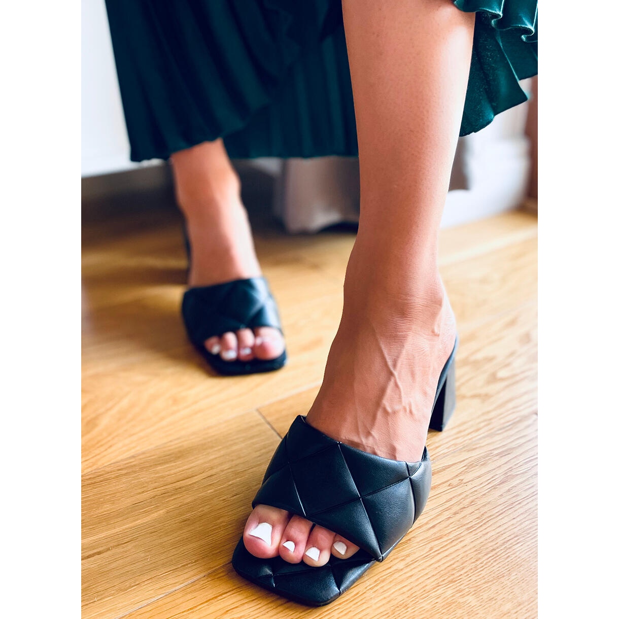Upptäck elegans och komfort i Helen Black flipflops med bred klack! Dessa svarta damtofflor med en höjd på 7,5 cm är det perfekta komplementet till alla stylingar, perfekta för både vardagsbruk och speciella tillfällen. Deras fashionabla, fyrkantiga snitt och iögonfallande quiltade mönster väcker uppmärksamhet och ger klass.
