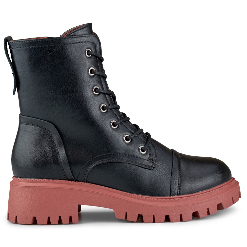 Moderna och universella brigittearbetare är ett idealiskt förslag för hösten/vintersäsongen. Tillverkad av ekologiskt läder, isolerade inuti och utrustade med en mjuk ekolivssinsats, ger värme och komfort under svalare dagar. En solid, syntetisk sula med en 4,5 cm -plattform lägger till stil och stabilitet, och kombinationen av snörning med blixtlåset gör det lättare att ställa in.