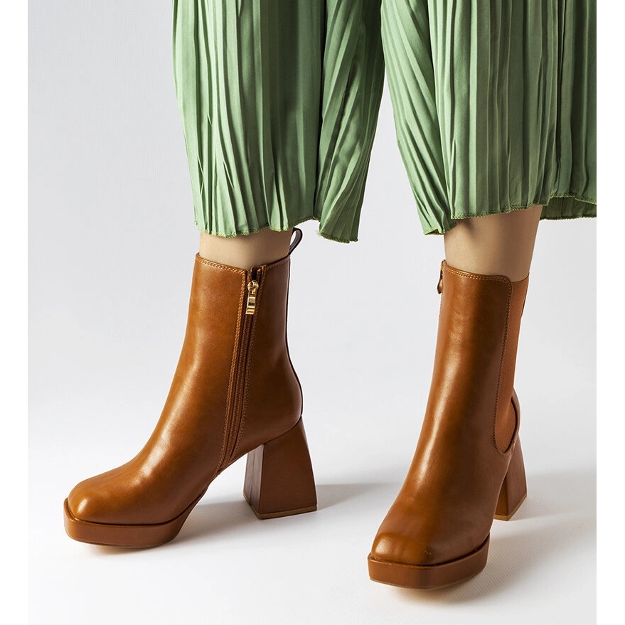 Bruna stövlar på den massiva Watson Post - en karamellklassiker som kommer att ge karaktär till alla stilisering. Vristen -återlämnande stövlar kännetecknas av en stark, 9 cm stolpe och en fashionabel fyrkantig näsa. En slät, rippad övre del av ekologiskt läder i en skugga "karamell" blandar sig väl med en lätt beige sula gjord av plast, vilket skapar en sammanhängande, elegant helhet.