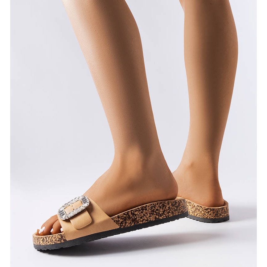 Ovandelen är gjord av ekologiskt läder av hög kvalitet med ett snyggt zirkoniumspänne, vilket ger modellen en unik karaktär. Den höga korksulan säkerställer inte bara komfort utan också unik stil. Användningen av gummi som sulmaterial garanterar hållbarhet och stabilitet, och innersulan i mocka av ekologiskt läder gör flip-flops behagliga för fötterna.