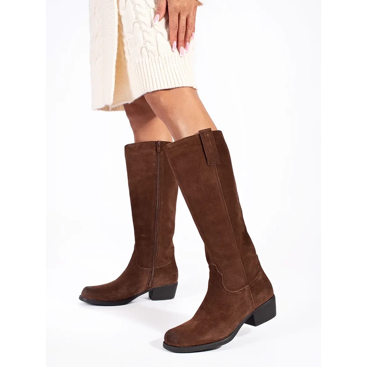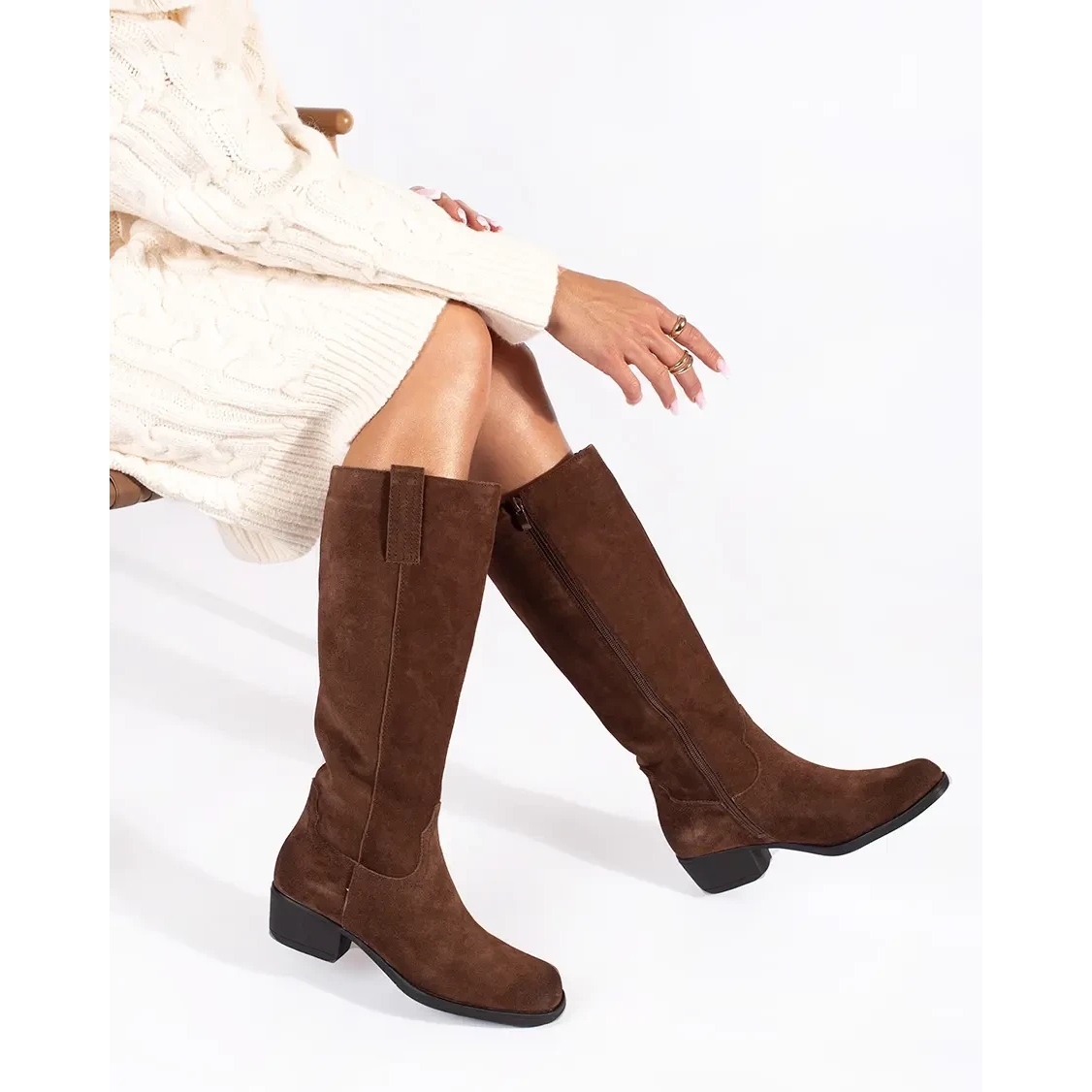Upptäck elegans och komfort från bruna isolerade kvinnors kosackar från Sergio Leone. Dessa klassiska stövlar är det perfekta valet för svalare dagar och kombinerar stil med funktionalitet. De är gjorda av naturliga mocka läder, de ser extremt eleganta ut, och deras bruna färg passar perfekt in i alla garderob.