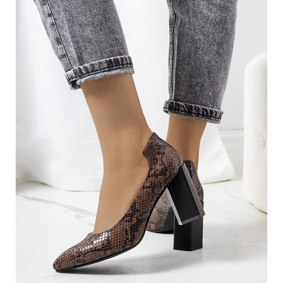 Den bruna färgen med en svart sula av plast ger pumparna ett klassiskt men moderiktigt utseende. Spetsiga tår gör dem smala och eleganta, vilket gör dem perfekta för olika tillfällen – från att gå till jobbet till kvällsmöten.