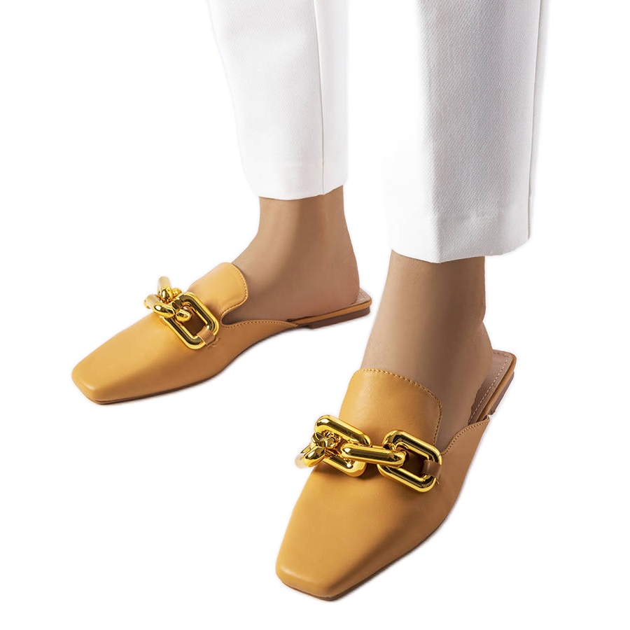 Snygga och bekväma slipflikar som kommer att fungera på sommaren, vardagliga stiliseringar. En inbyggd övre med en fyrkantig, smal näsa och en något oregelbunden finish ger modellen en modern karaktär, och en tjock guldkedja betonar den eleganta accenten. Tillverkad av Eco -Leather -De ser lyxiga ut, kvarvarande hudvänliga och lätta att ta hand om.