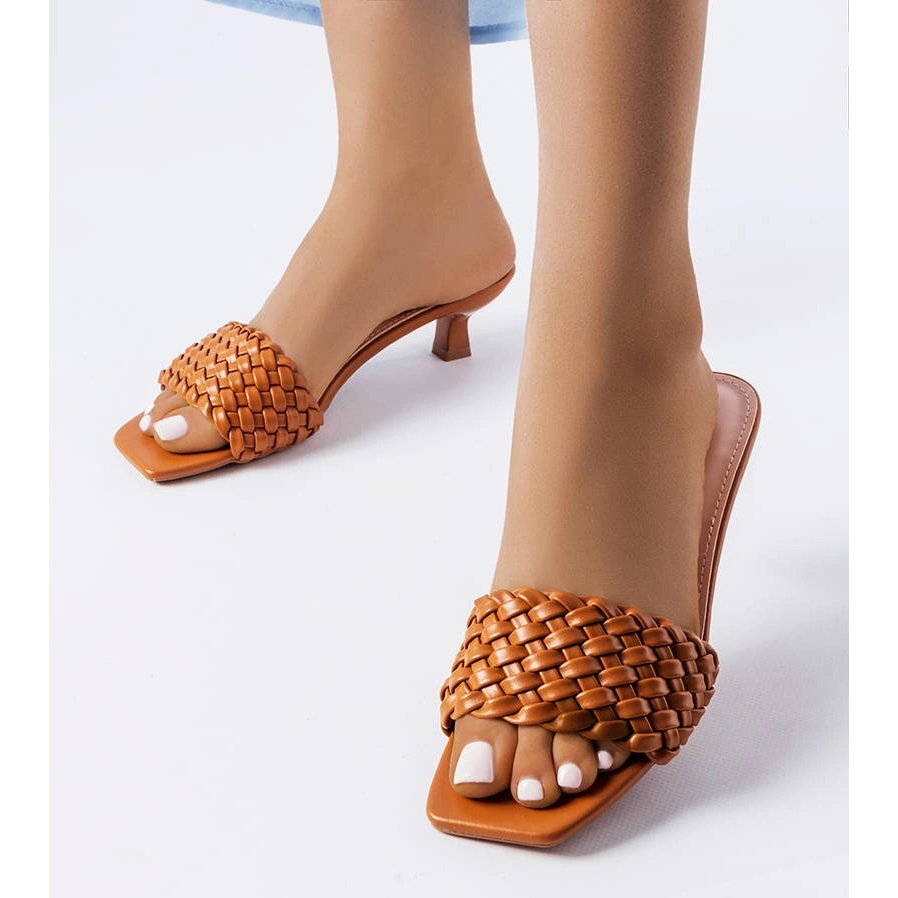 Bronze Low -Heeled Bourbank Flip -flops -Ett snyggt och bekvämt komplement till sommarstyliseringar. Slippade flip flops med en öppen, fyrkantig tå och ett brett bälte i form av en fläta, gjord av högkvalitativt ekologiskt läder. Låg, stabil stift ger lätthet och feminin, samtidigt som den säkerställer komfort hela dagen.