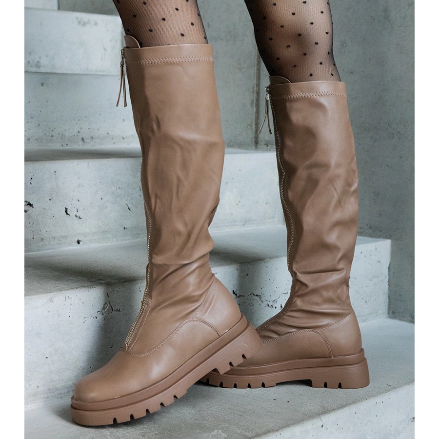 De har en knähöjd (49 cm) och har en rund näsa, som inte bara betonar deras stil, utan också ger komfort när de bär. Tack vare blixtlåsfästningen, sätta på och ta bort stövlar är det snabbt och bekvämt. Den bruna färgen, känd som khaki, och den bruna gummisulan är den perfekta kombinationen som kommer att lägga till karaktären på alla stilisering.