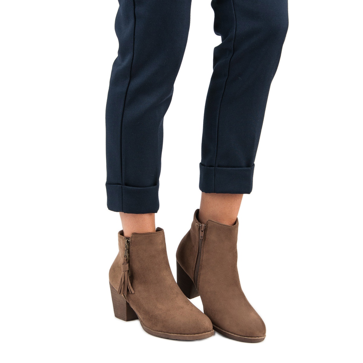 Skorna kännetecknas av en 7,5 cm klack i form av ett block, vilket säkerställer stabilitet och komfort att bära. Den trampade sulan av plast ger bra grepp, vilket är särskilt viktigt under kallare dagar. En extra dekoration är guldaccenter i form av en snygg dragkedja och avtagbara fransar, som ger stövlarna en modern karaktär.