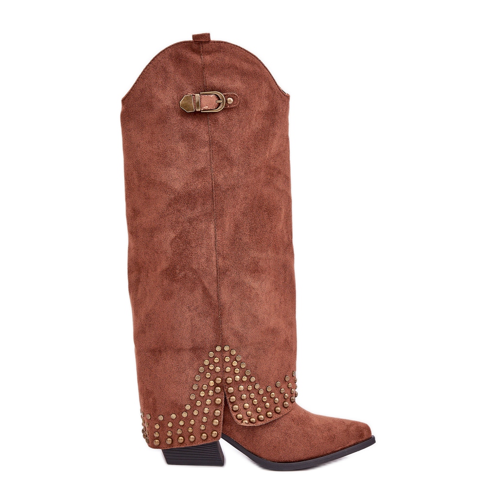 Stövlar med en upphöjd övre på en brun stolpe är ett idealiskt förslag för kvinnor som vill kombinera fashionabla stil med komfort. Dessa eleganta stövlar är gjorda av högkvalitetsmatta och passar perfekt i nuvarande trender, medan de erbjuder den ursprungliga designen tack vare en upphöjd övre, dekorerad med strass och ett elegant spänne.