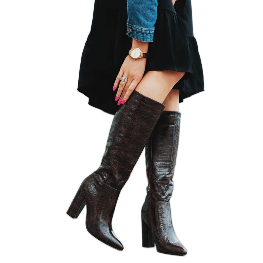 Vi presenterar bruna Phoebo högklackade stövlar - det perfekta valet för vintersäsongen, som kommer att framhäva din eleganta stil. Dessa mörkbruna stövlar är gjorda av läderliknande material, och deras fantastiska krokodilmönster ger dem originalitet och en unik karaktär.