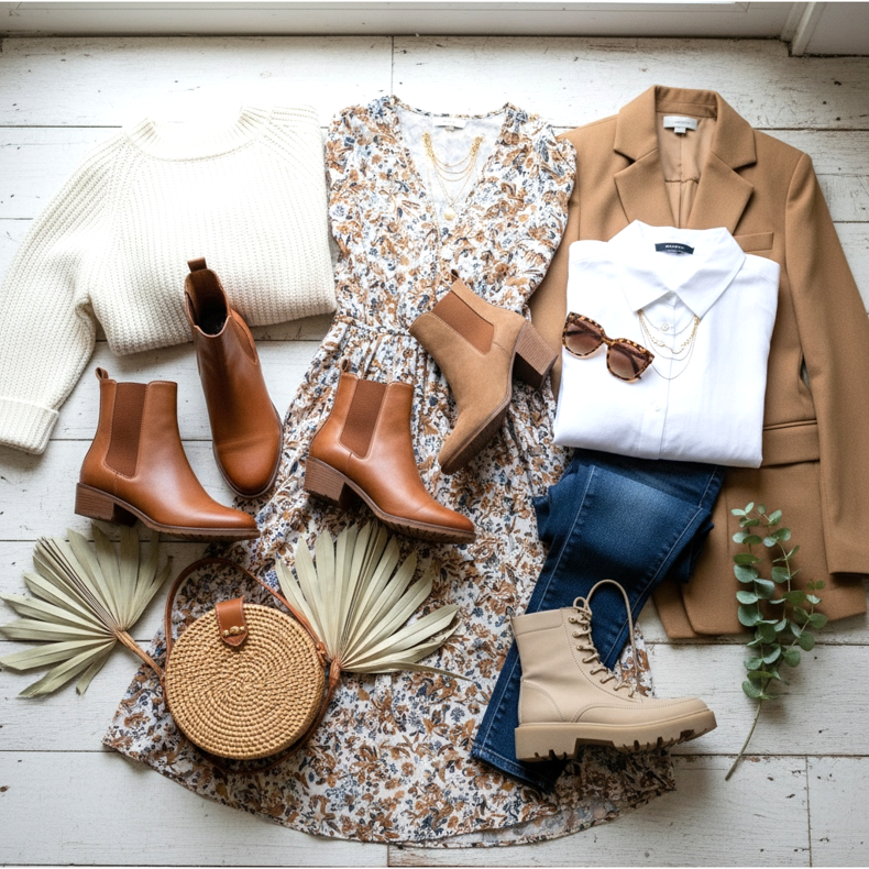 Nyckeln till den här looken ligger i proportionerna: midiklänningen - som slutar runt mitten av vaden - passar perfekt till fotkängorna, som är fullt synliga. Brunt ger hela looken en varm, vårlig energi, medan klänningens blommönster balanserar det råa lädret i skorna.