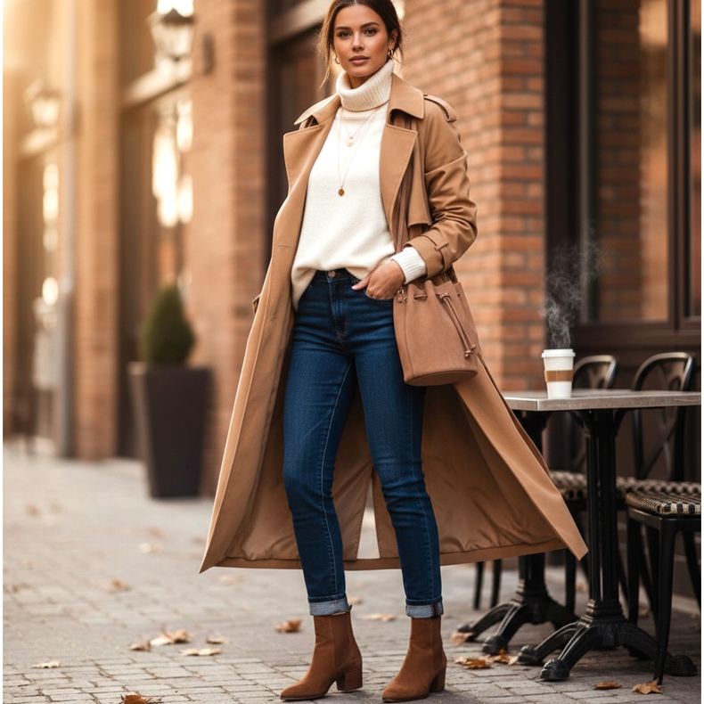 Denna outfit kommer att kompletteras med en lång kamelfärgad trenchcoat, en bucketväska i nude mocka och diskreta guldsmycken. Det är en look du kan bära både till morgonkaffet och för ett avslappnat affärsmöte på kontoret. Den är bekväm, snygg och alltid uppdaterad.