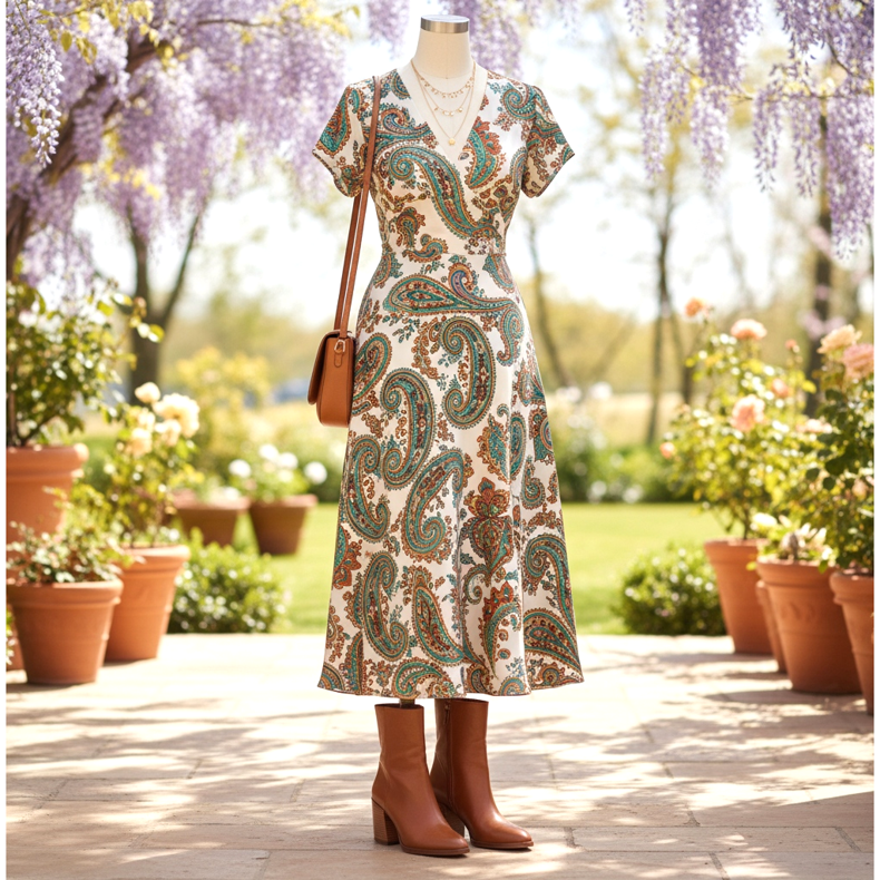 En midiklänning av viskos eller siden i paisley- eller blommönster kombinerat med bruna högklackade ankelboots är den perfekta looken för ett vårbröllop eller en älskads födelsedag. Lägg till en solbränd axelväska i läder och ett delikat halsband - effekten är klar.