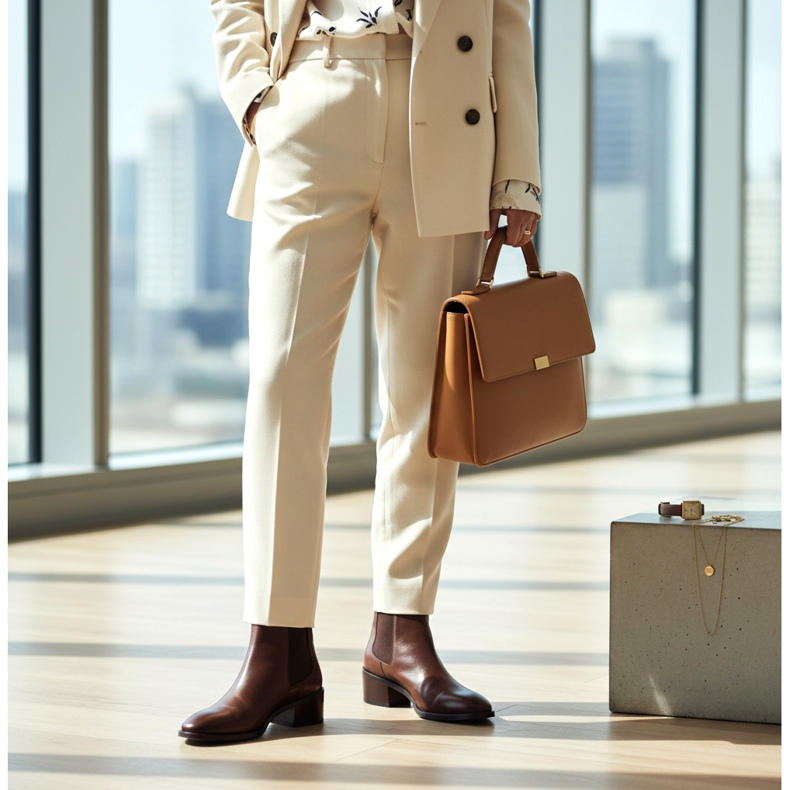 En kostym i kräm, beige eller pastellfärg kombinerad med bruna Chelsea-stövlar är en av de starkaste lookerna inom herr- och damkläder 2026. Brun som ett par med en ljus kostym – istället för svarta skor – skapar en mer manlig och mjukare kombination.