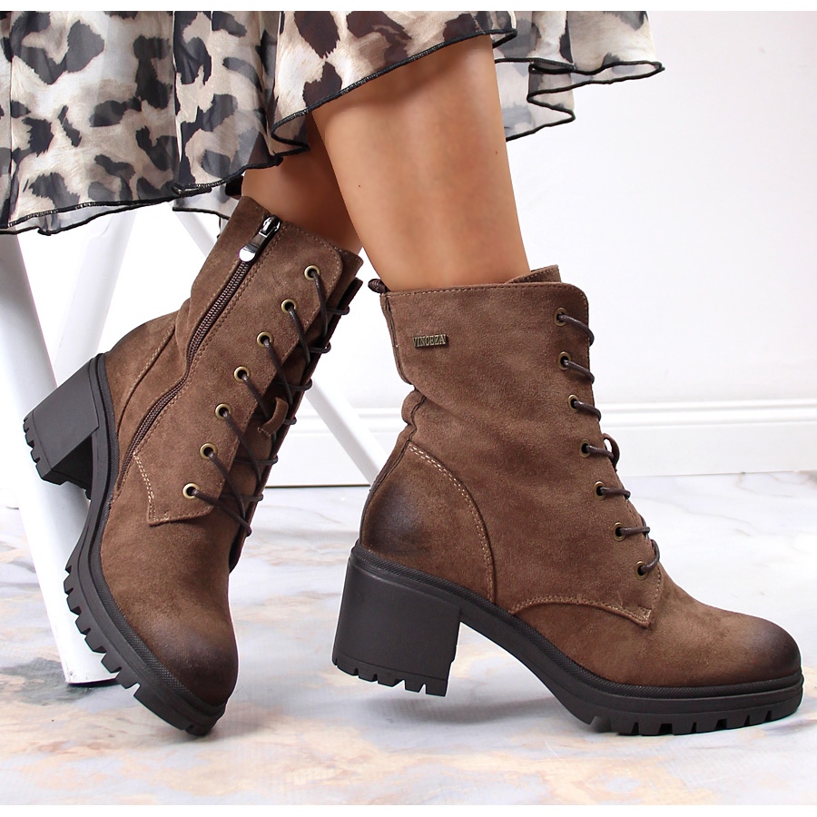 Isolerade ankelstövlar i brun mocka från Vinceza är ett perfekt val för kallare dagar, som kombinerar elegans med vardagskomfort. Dessa ankelstövlar för kvinnor är gjorda av miljövänligt mockaläder och är inte bara snygga utan också miljövänliga. Deras övre höjd på ca 16 cm gör att de täcker fotleden perfekt och håller sig samtidigt uppdaterade med skotrender.