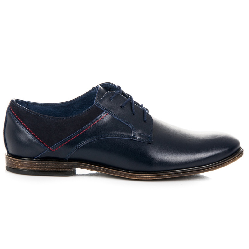 Eleganta, raffinerade skor för en man som uppskattar klassiker med en distinkt accent. Toppen är gjord av högkvalitativt naturligt läder - slitstarkt, motståndskraftigt och lättskött. Kontrasterande röda sömmar ger karaktär och livar upp subtilt den dämpade blå nyansen på skorna. Snörningsmodellen, med en rund tå och en inbyggd, förstyvad häl, säkerställer komfort och stabilitet när den bärs.