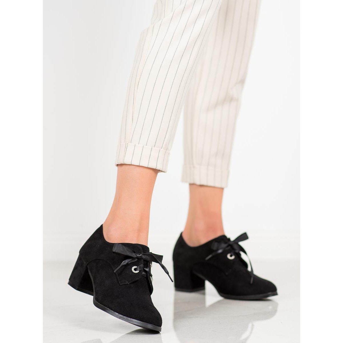 Lär känna elegansens klassiker i en modern version - svarta högklackade pumps med snörning från tillverkaren SHELOVET. Dessa vackra damskor har noggrant tillverkats av miljövänlig mocka, vilket gör dem till ett idealiskt val för dem som föredrar veganska produkter. Deras klassiska, runda tå och mjuka, inbyggda häl garanterar komfort att bära hela dagen.