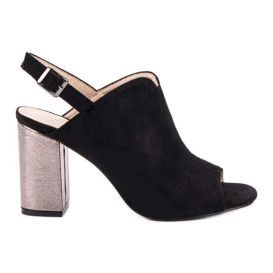 Tack vare den ursprungliga kombinationen av klassiskt svart med en karakteristisk silverklack kommer dessa högklackade högklackade sandaler inte bara att bli ett bra komplement till din garderob, utan också ett bra sätt att liva upp även den enklaste stylingen. Ett raffinerat snitt i en elegant modestil kommer att få dig att känna dig säker och snygg i alla situationer.