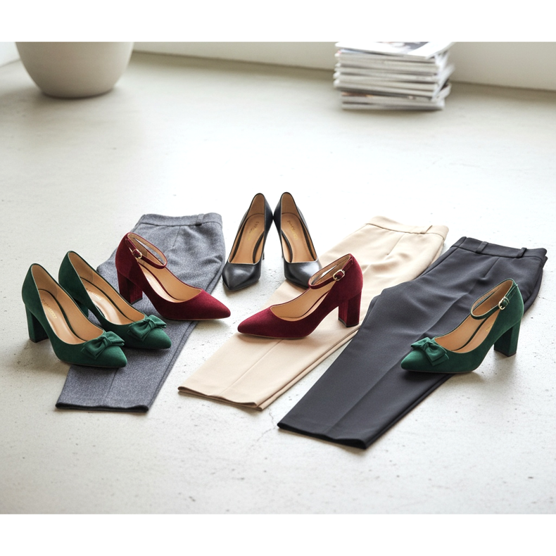 Svarta stiletter passar perfekt till svarta byxor med raka ben, vilket skapar en monokromatisk, elegant stil. Du kan också välja skor i en kontrasterande färg – röd, guld eller till och med rosa – som kommer att liva upp hela outfiten och ge den karaktär.