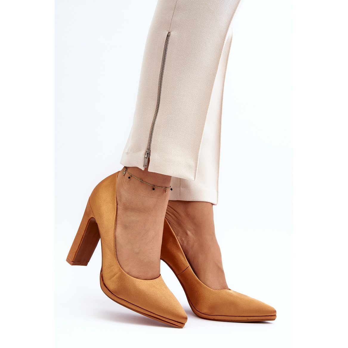 Materialet som pumparna är gjorda av är ett högkvalitativt textiltyg som perfekt imiterar satin och ger skorna en lyxig look. Den unika "CAMEL"-färgen som föreslagits av tillverkaren är en universell nyans av brunt som matchar många färger och är lätt att integrera i olika stilar.
