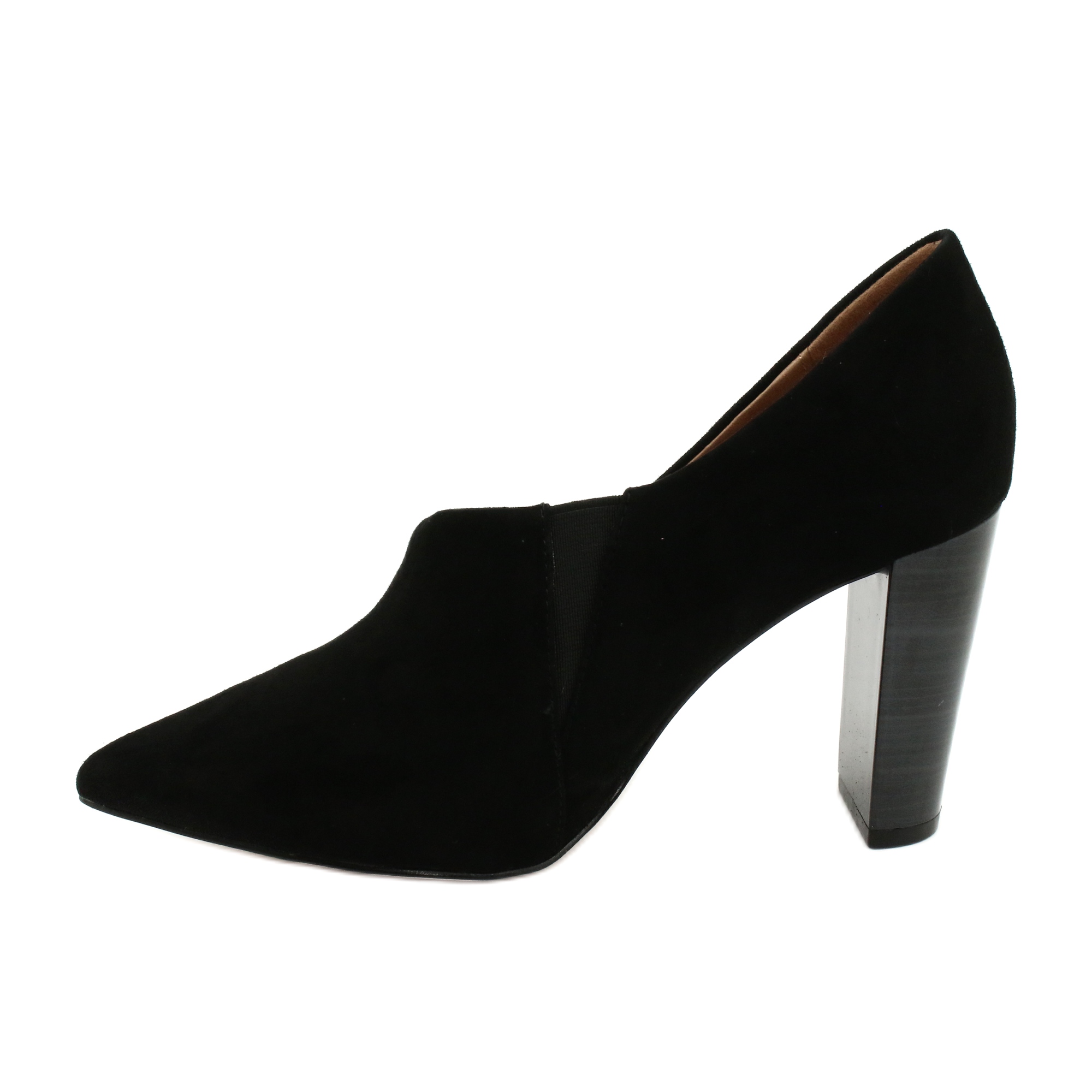 Eleganta kvinnors svarta skor i svart (svart mocka) är en kombination av klassisk form och komfort. Tillverkad av naturligt nubuckläder, med ett helt läderfoder och en mjuk insats, ger de komfort under dagen. En smal, spetsig näsa och en högkvalitativ finish ger dem stil, och en stabil klack ungefär 8 cm hög subtilt smal figuren.