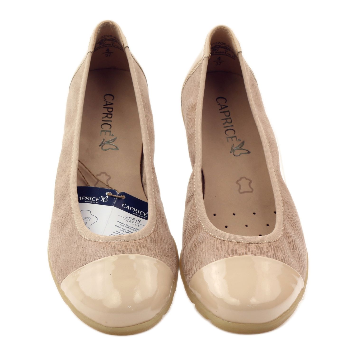 Upptäck elegans och komfort med balettlägenheter 22152 från Caprice! Dessa unika damskor är gjorda av naturligt läder av högsta kvalitet, vilket gör dem inte bara attraktiva, utan också extremt trevliga att bära. Den beige färgen, i kombination med den lackade spetsen, tillför lätthet och klass till dem, perfekt matchande samtida trender.