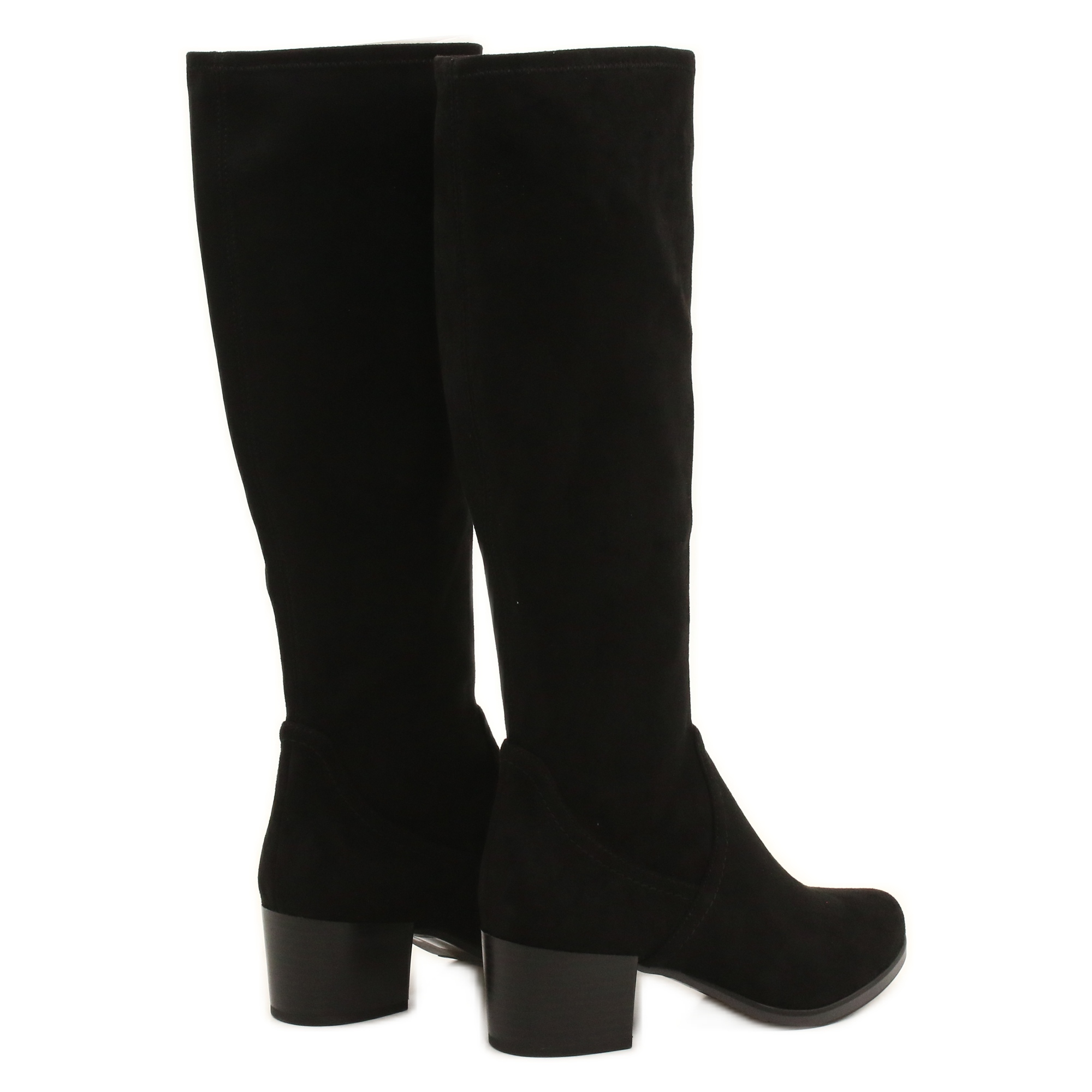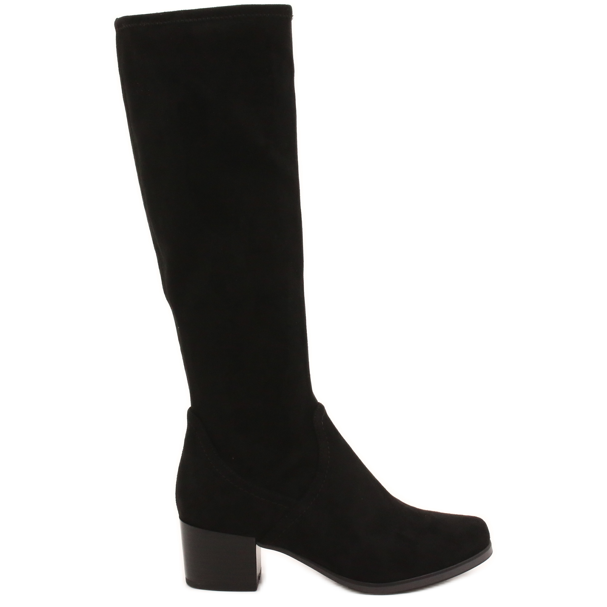 Långa, eleganta caprice -stövlar gjorda av täta, stretchiga textilmaterial (stretch) i en universell svart färg. Tack vare det elastiska tyget anpassar de övre fint till kalven och säkerställer ett snyggt utseende och komfort att bära. PFI 100% vegansk modell - utan djurkomponenter.