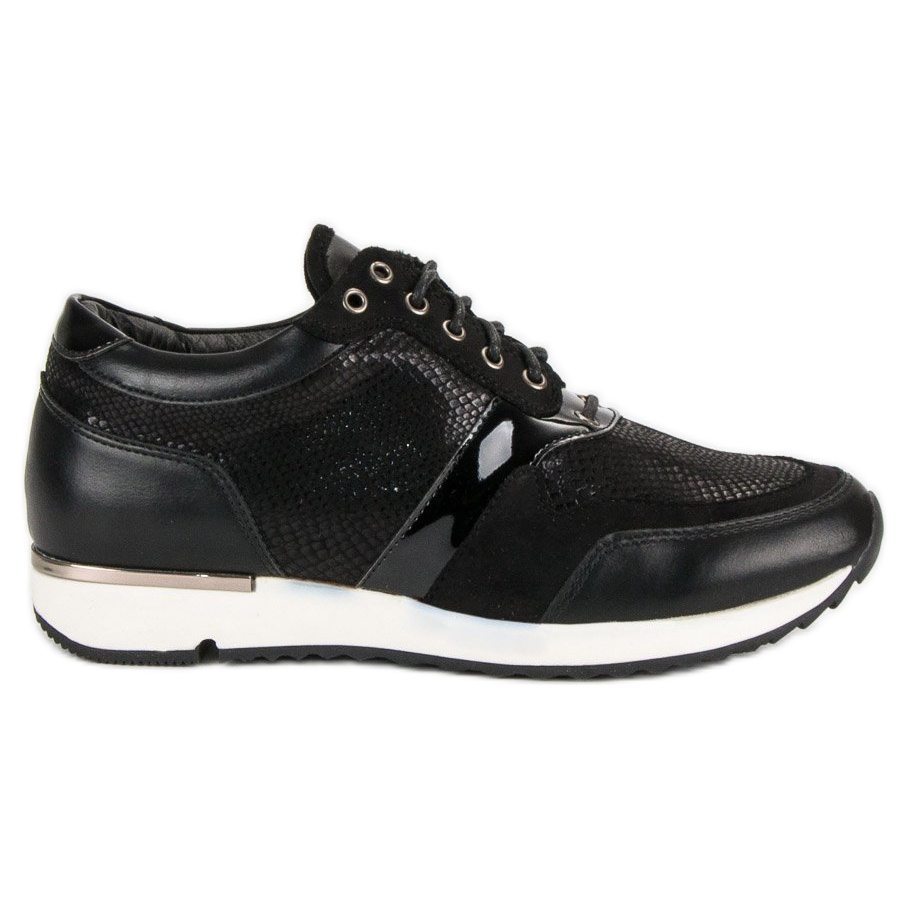 Svarta avslappnade damsneakers från Filippo är den perfekta lösningen för kvinnor som vill kombinera stil med komfort. Dessa fashionabla skor kommer att passa perfekt in i alla vardagliga, urbana utseenden och lägga till fräschör och originalitet. Tillverkade av ekologiskt läder i tre intressanta texturer - slät, patent och orm - de drar till sig uppmärksamhet och sticker ut från bakgrunden av klassiska modeller.