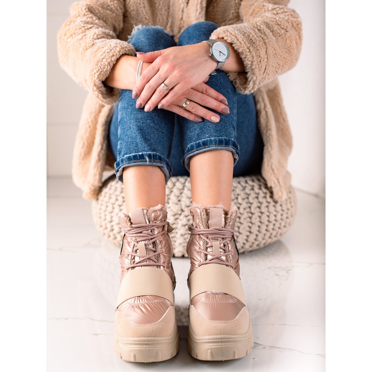 TRENDI snöskor är ett utmärkt val för kvinnor som värdesätter ett moderikt utseende och vardagskomfort. Dragkedjan och snörningen gör det enkelt att ta på och av skorna. Dessa beige stövlar kommer att passa bra med alla vinterkläder, från jeans till varma tröjor.