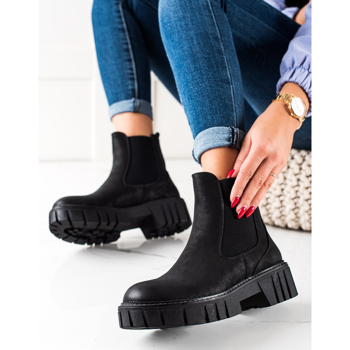 Den övre bredden på 20 cm och den övre höjden över ankeln (13 cm) säkerställer en perfekt passform till foten. Dessutom gör den vackra svarta färgen och enkla, mönsterlösa designen att dessa stövlar perfekt matchar en mängd olika stilar.