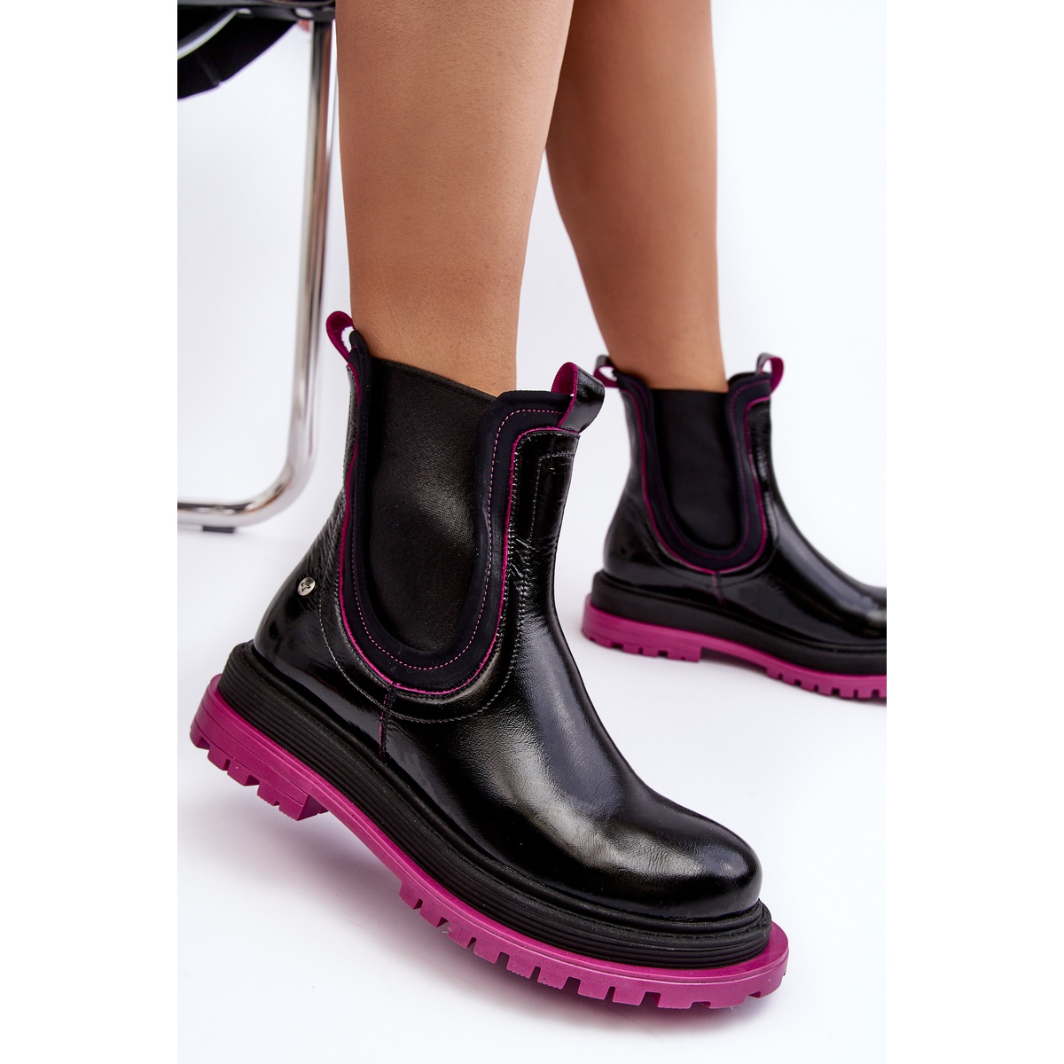Moderna, fashionabla stövlar från den polska tillverkaren Maciejka, gjorda av lackerat naturläder. De kännetecknas av en massiv, gummisula i en kontrasterande fuchsia/rosa färg och en bred, platt häl, som säkerställer stabilitet och komfort när man går. Idealisk modell för hösten/vintersäsongen - en snygg accent för vardagliga och halvformala stiliseringar.