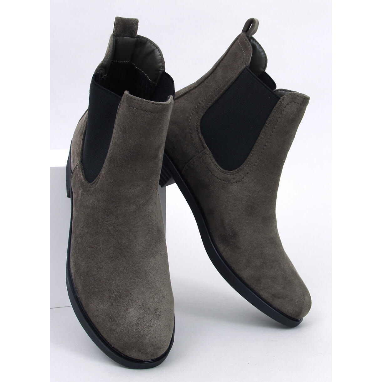 Upptäck elegans och komfort med mocka jackor med terra grönt gummi i en grön nyans. Dessa klassiska kvinnors stövlar kombinerar modern stil och miljövänliga material. Deras minimalistiska design, avslutad med svarta flexibla insatser, gör dem till ett utmärkt val för fashionabla kvinnor som vill betona sin individuella stil.