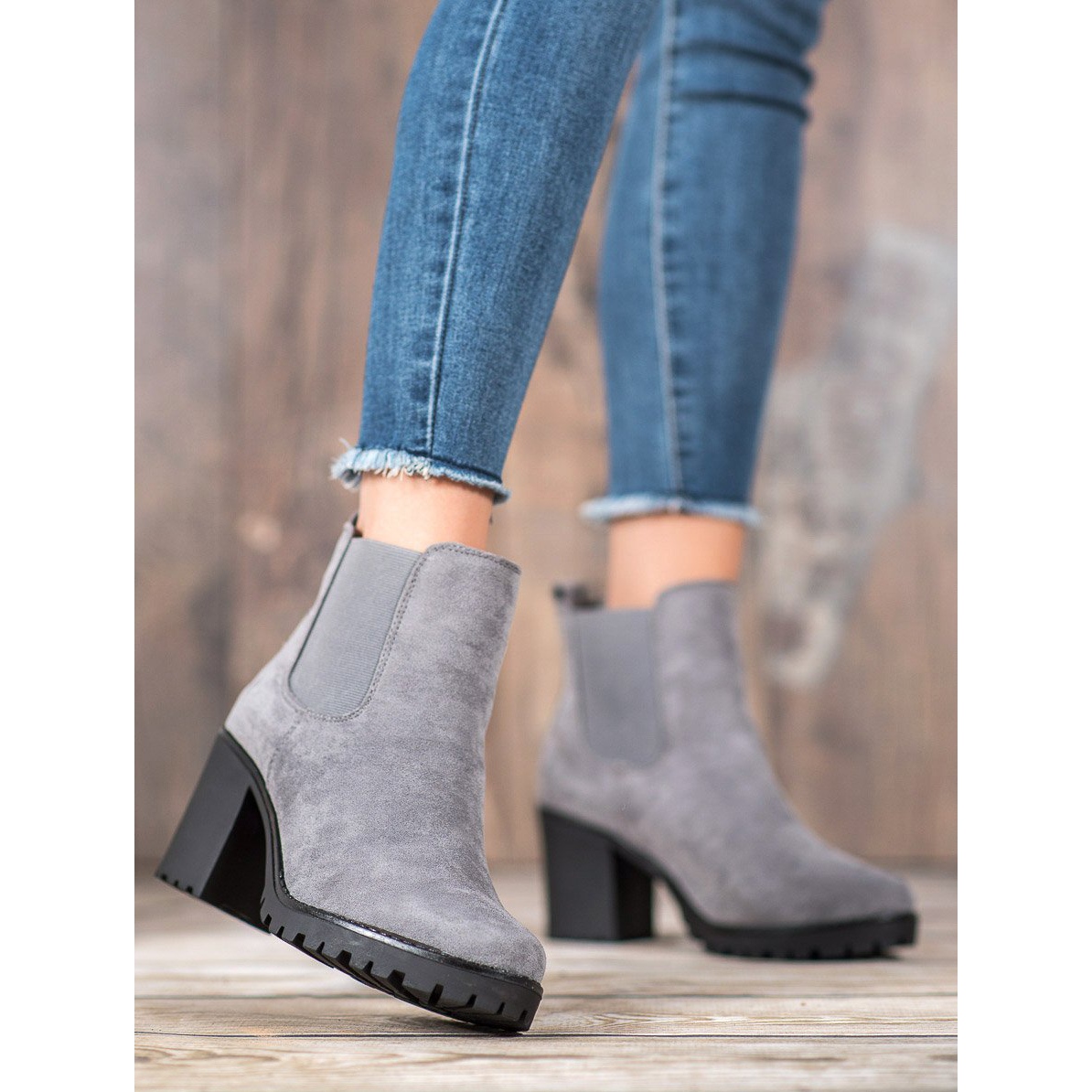 Detaljer: Queentina Chelsea stövlar på en bar grå
