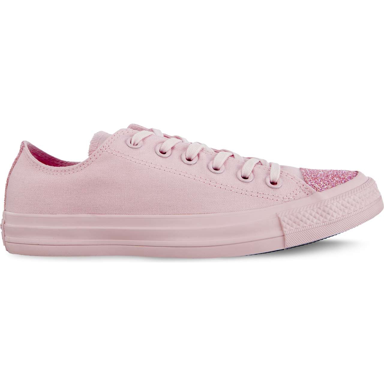 Converse Chuck Taylor All Star C563466 Pink Foam - Light Sneakers med en modern, feminin finish. Det övre av tillverkbart tyg i nyanser av lila och rosa har dekorerats med glitter på framsidan och hälen, vilket ger en effektiv, subtil prakt till stadsstyliseringar. Låga, snörda skor med en rund tå fungerar både dagligen och för avslappnade, fashionabla uppsättningar.