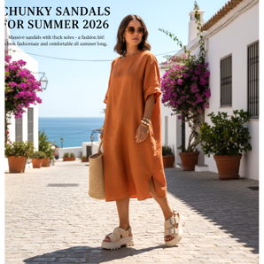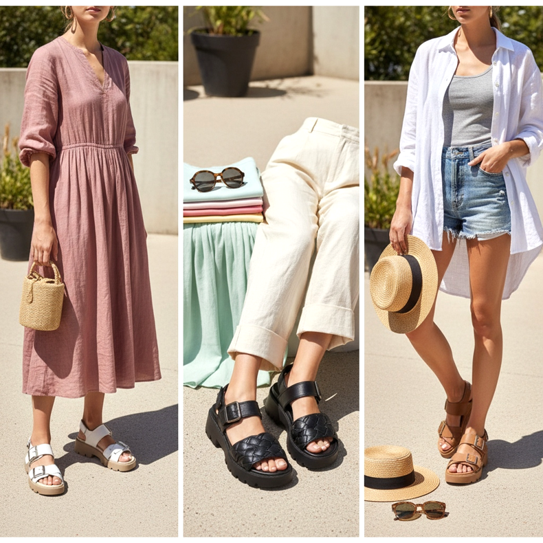 Massiva sandaler med vida byxor är sommarens hit 2026. Spegelklänningar eller luftiga linnebyxor matchar perfekt den tjocka sulan och skapar en balanserad, moderiktig look. Tänk på att benlängden ska nå vristen eller vara lätt upprullad så att skorna syns.