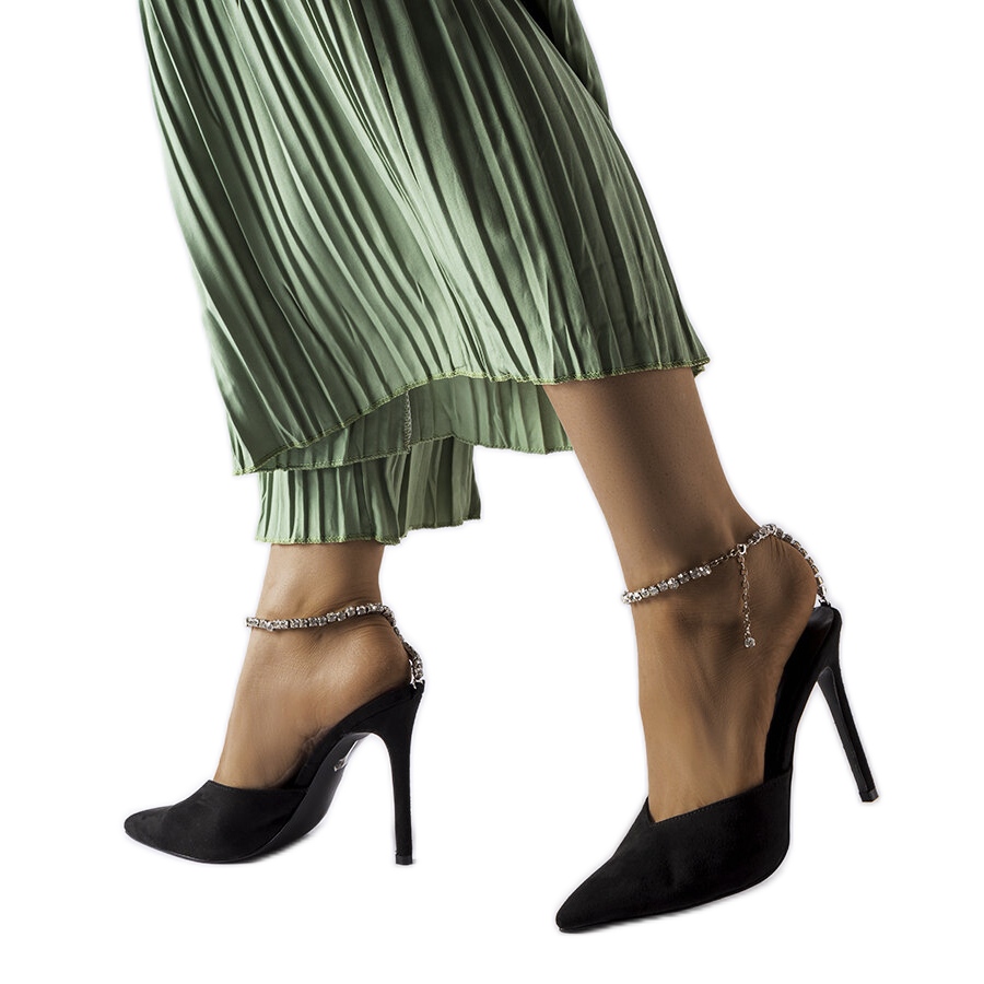 Vi presenterar eleganta svarta Claude högklackade flip-flops med strass, som perfekt kommer att komplettera varje styling, både varje dag och för speciella tillfällen. Dessa flipflops är gjorda av högkvalitativt ekologiskt mockaskinn och erbjuder inte bara ett moderiktigt utseende, utan också komfort att bära.