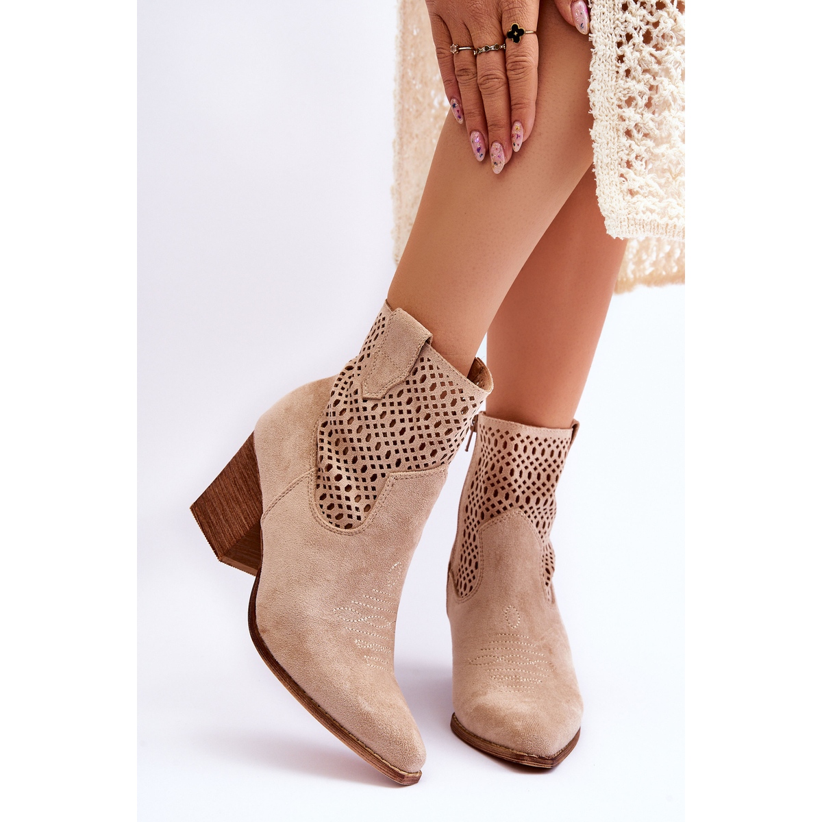 Upptäck de extraordinära cowboystövlarna i mocka för kvinnor FB1, som perfekt kombinerar klassisk stil med en modern finish. Dessa beige högklackade ankelboots är det perfekta valet för varje kvinna som vill sticka ut i mängden. Ankelöverdelen är gjord av ekologisk mocka, dekorerad med ett genombrutet mönster och subtila sömmar på framsidan, vilket ger dem en unik karaktär.