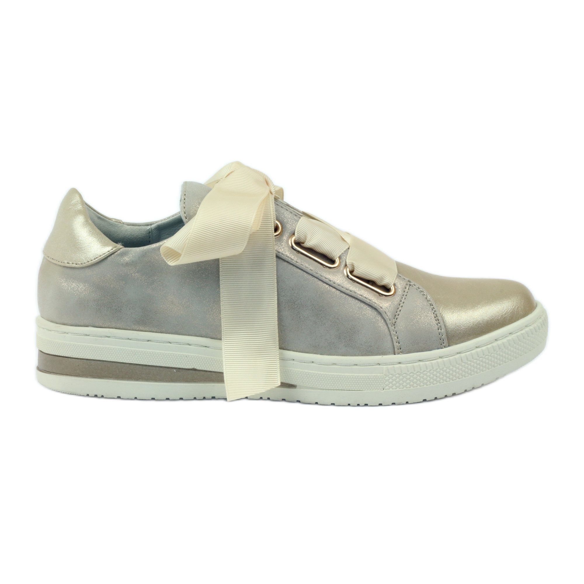 Dessa gyllene skor kännetecknas av dekorativa remmar med ett snyggt band gängat genom dem, vilket ger dem en unik karaktär och gör dem iögonfallande. Sätt på en platt, vit sula, 3 cm hög, förlänger de försiktigt benen samtidigt som de säkerställer stabilitet och komfort.