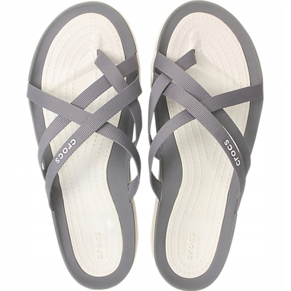 Crocs Swiftwater Webbing Flip 205479 Oct - Women's Light Grey Flip -flops, skapad för daglig aktivitet och sommarutgångar. Mjuka, flexibla överdelar anpassar sig väl till foten, och det ursprungliga skummet absorberar varje steg, vilket ger en känsla av mjukhet och komfort under dagen. Den enda inspirerade av vågorna var utformad för att förbättra vidhäftningen och minska risken för att glida - bra på stranden, över poolen och för promenader runt staden. Tillverkad av permanenta syntetiska material, enkla att rengöra och fuktresistenta.