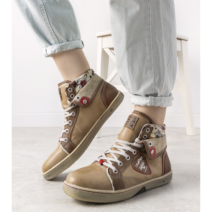 Beige högtoppade sneakers för kvinnor Niente är det perfekta valet för kvinnor som värdesätter komfort och stil i vardagsstyling. Dessa fashionabla sneakers, tack vare sin unika ovandel dekorerad med ett charmigt blommönster, kommer säkerligen att locka uppmärksamhet och ge karaktär till alla kläder.