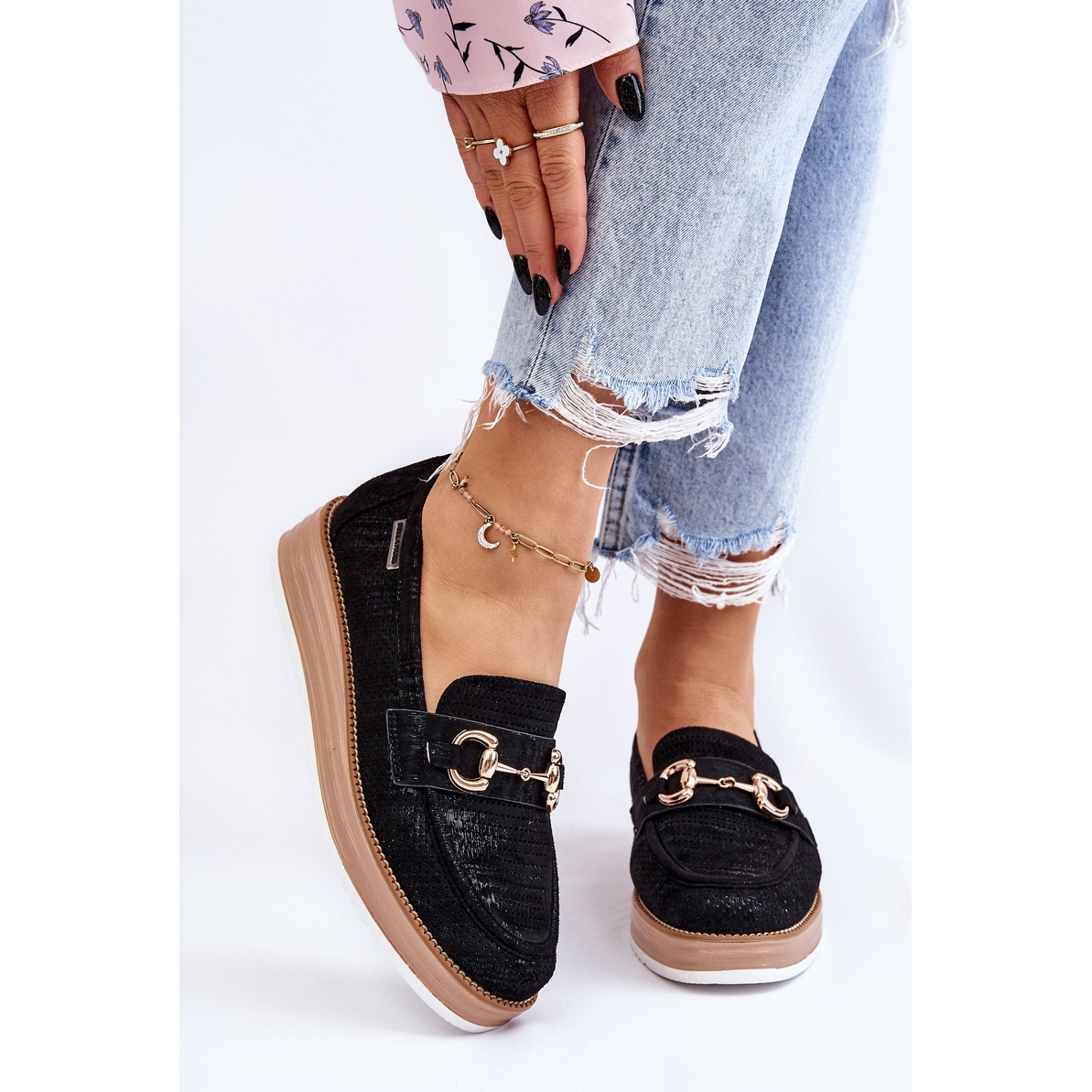 PM1-mockasiner kännetecknas av en styvad häl, vilket dessutom ökar deras stabilitet och bärkomfort. Det dekorativa elementet på framsidan ger dem en unik karaktär, och den svarta färgen gör dem till ett perfekt komplement till många vår- och höststilar. Tack vare den övre höjden på 5,5 cm och plattformshöjden på 2,5 cm ser dessa skor inte bara bra ut, utan förlänger också benen optiskt.