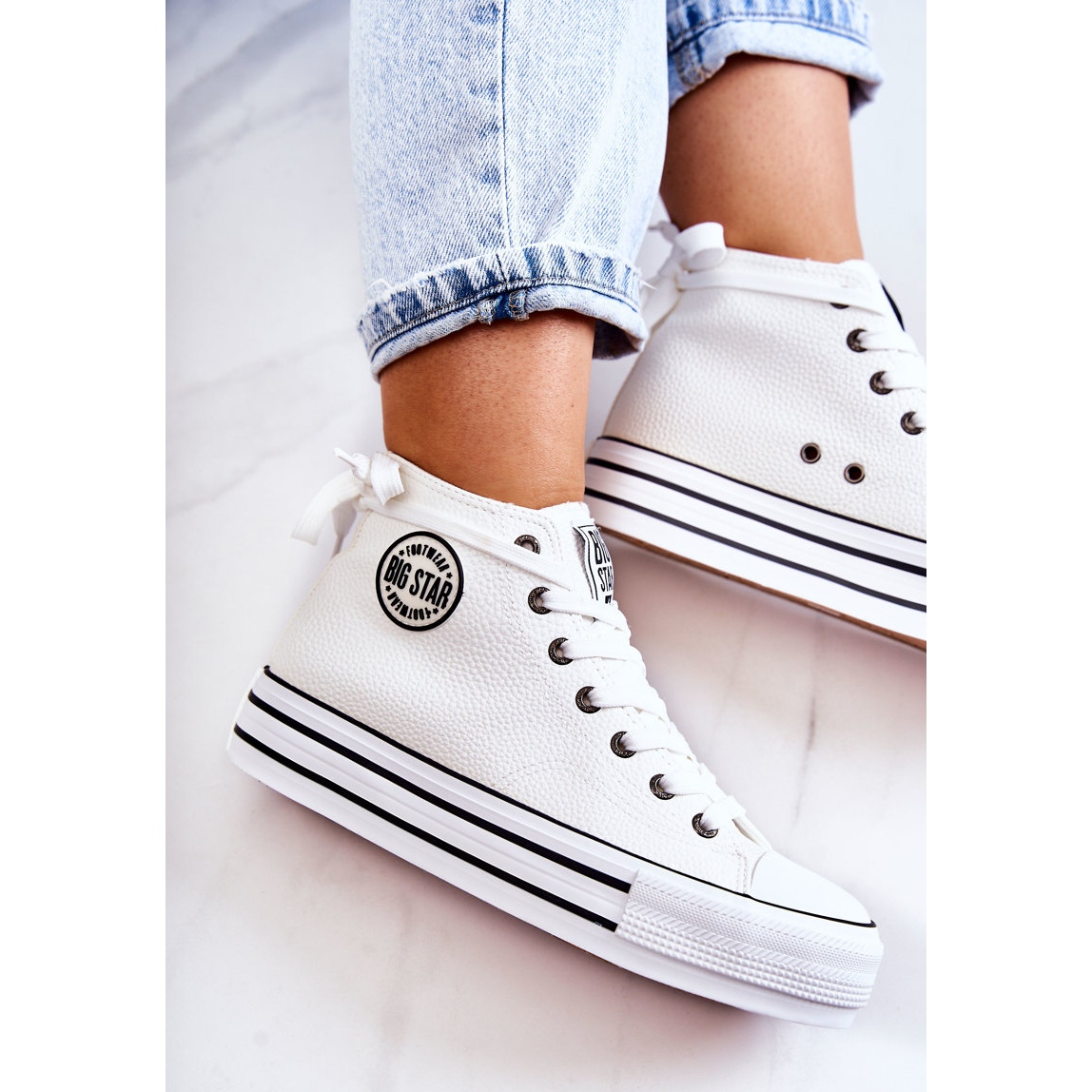 Kvinnors Big Star White GG274013 sneakers - en klassiker i en modern upplaga. Höga, vita sneakers med ett tidlöst snitt, vilket perfekt kompletterar både avslappnade och mer avant -garde -stiliseringar. Tjock, 4 cm sula lägger till karaktär och ger komfort dagligen.