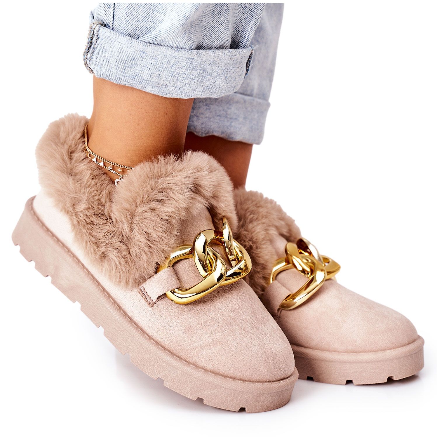Tofflorna är omsorgsfullt gjorda av behaglig syntetpäls, vilket säkerställer inte bara optimal komfort, utan även värme under kalla dagar. En ytterligare fördel är en iögonfallande guldkedja som ger dem en elegant och modern karaktär. Tack vare detta blir tillbehöret ett perfekt komplement till både vardagliga och mer sofistikerade stilar.