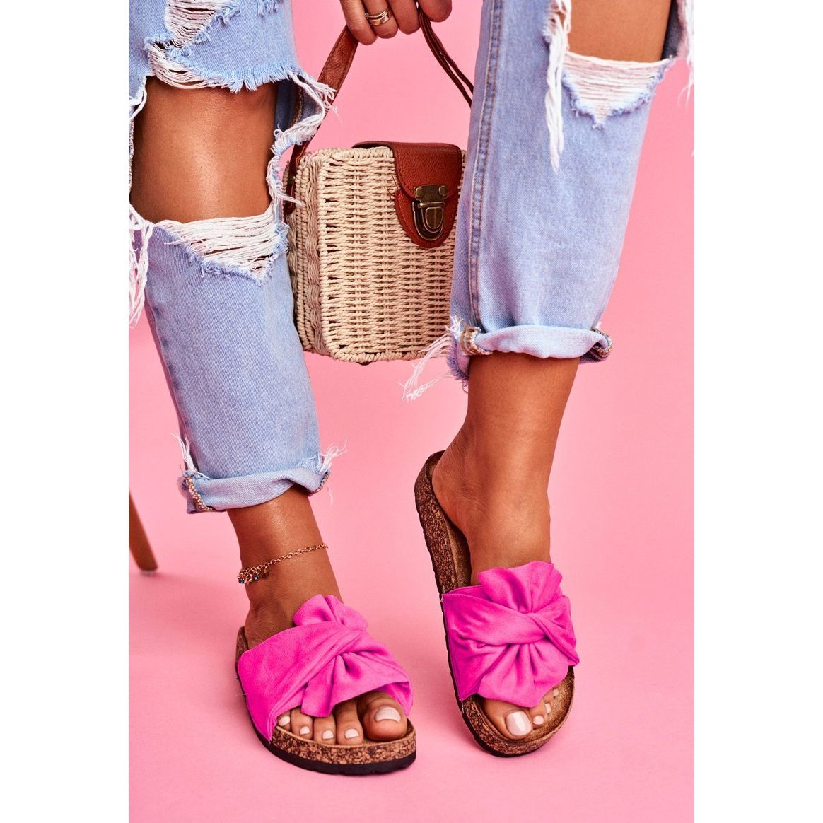 Upptäck sommarens charm med damflipflops med korksula från märket PS1! Dessa unika flip-flops i en vacker nyans av fuchsia, dekorerade med en charmig rosett, är en oskiljaktig del av sommarens styling. Deras design är inte bara estetisk, utan också funktionell - slip-on-designen möjliggör snabb påsättning, och den profilerade, mjuka innersulan garanterar komfort även när den bärs under lång tid.