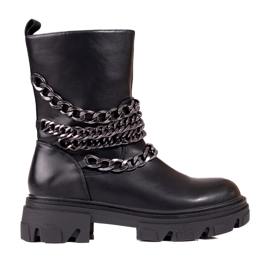 Snygga, svarta kvinnoarbetare med en dekorativ kedja - perfekt för hösten/vintersäsongen. Tillverkad av ekologiskt läder, isolerat med en skorfilt, med en bekväm blixtlås och en stabil sula med en slitbana. Kombinationen av rockkaraktär med daglig bekvämlighet.