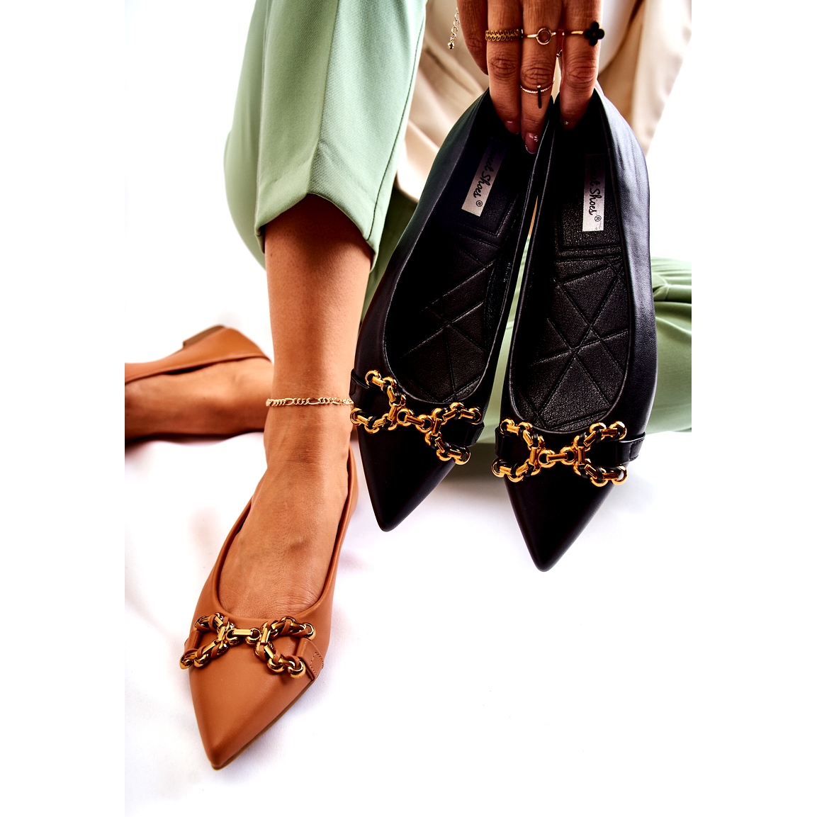 Insidan av skon har designats med din komfort i åtanke - innersulan i ekoläder säkerställer mjukhet och komfort, vilket gör ballerinaskorna perfekta för alla situationer. Dessutom har denna modell spetsiga tår, vilket ger dem ett lite elegant utseende.
