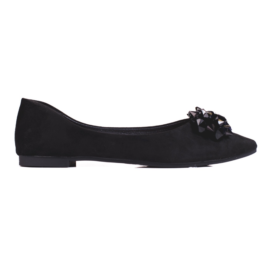 Ballerinaskor kännetecknas av en uppbyggd, mjuk klack, som säkerställer bärkomfort och fotstabilitet. Deras runda tå låter dig röra tårna fritt, och den släta, syntetiska sulan ger grepp och flexibilitet vid varje steg. En ytterligare fördel är eleganta kristaller som ger en nypa glans och gör dessa skor till ett idealiskt val för olika stilar.