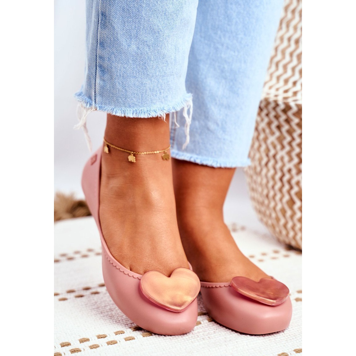 Deras behagliga doft ger charm, och de hjärtdekorerade detaljerna skapar en unik look som säkerligen kommer att dra till sig uppmärksamhet. Ballerinaskornas insida har designats med maximal komfort i åtanke - en mjuk skuminnersula täckt med ett delikat material tar hand om dina fötter hela dagen lång.