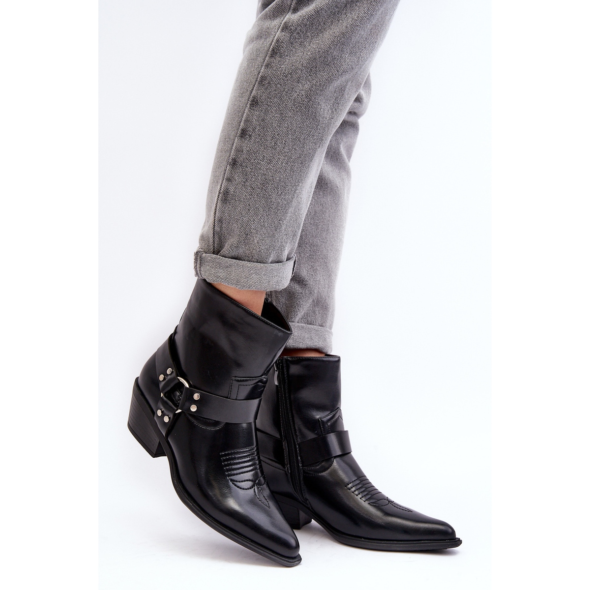 Snygga cowboystövlar som kombinerar fashionabelt utseende med komfort varje dag. Tillverkad av ekologiskt läder, beläget på en låg, 5 cm häl - perfekt om du letar efter fotledskor som optiskt smalar figuren tack vare den spetsiga tån. Den övre (15 cm höga) dekorerade med sömmar, anslutna ränder och detaljer som strass och broderi, ger karaktären av all stilisering. Agenten isolerade med en mjuk skorfilt - perfekt för svalare dagar. Kopplingsfästet gör det lättare att infoga, och plastsula säkerställer permanent stabilitet.