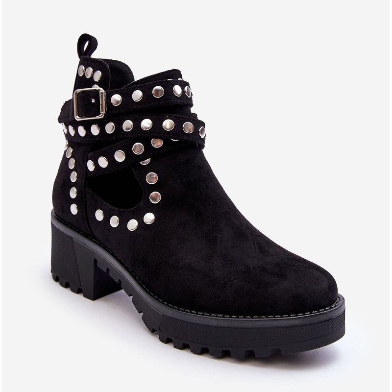 Snygg, bekväm och med en klo - Bella stövlar är ett förslag för kvinnor som letar efter en klassisk form med en fashionabla accent. Tillverkad av Eco-Sham, dekorerad med silverpinnar och strass, inbäddade på ett stabilt block med en subtil plattform. Gled, med ett bälte fäst med ett spänne och fashionabla utskärningar på sidorna - perfekt dagligen och för fler stenstyliseringar.